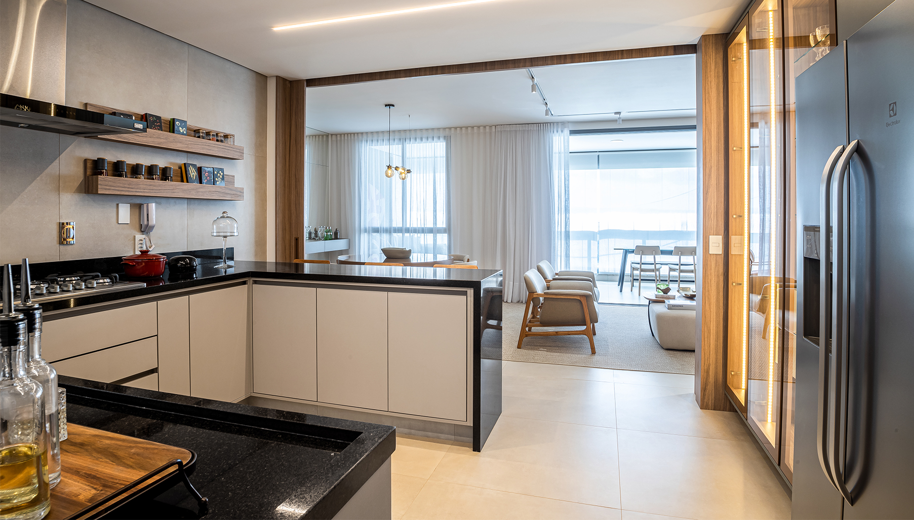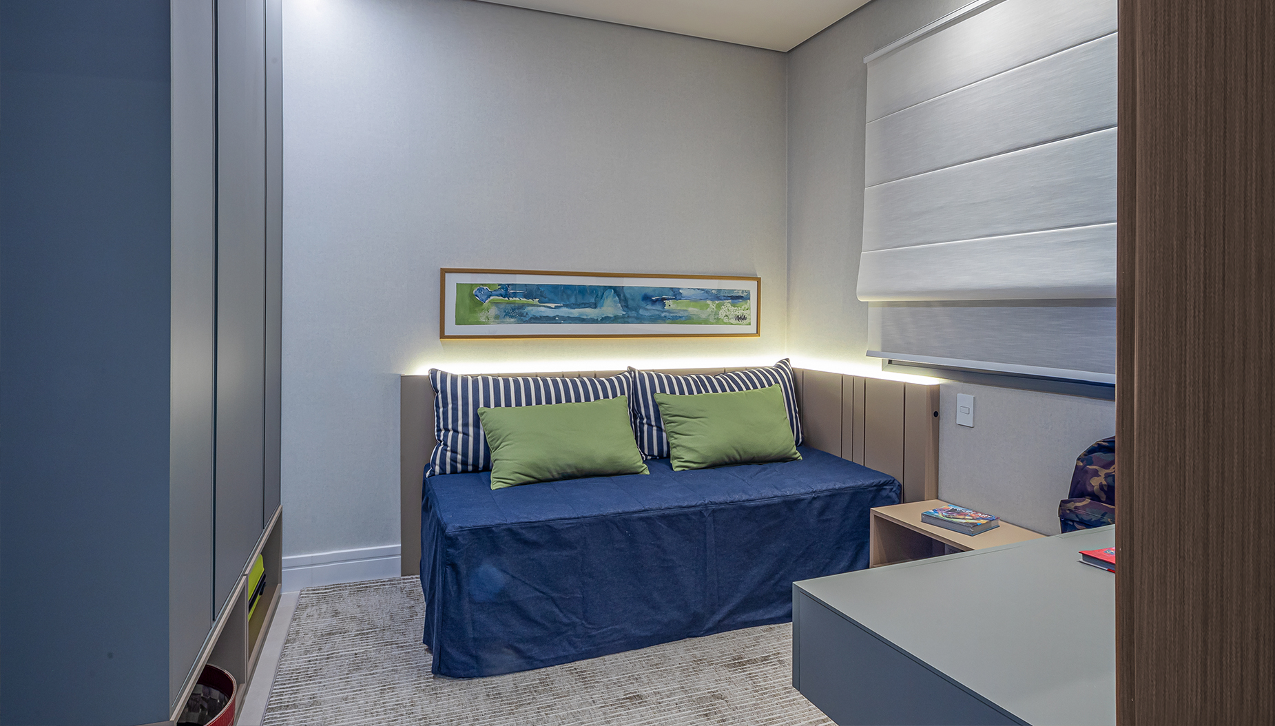 Além da paleta de cores, a iluminação também tem o seu papel na arquitetura do bem-estar. O cuidado com a escolha de luminárias e aproveitamento de fontes de luz natural cria atmosferas que vão do aconchegante ao funcional. O equilíbrio harmônico entre a luz natural e artificial realça a estética do espaço e cria um ambiente que promove o conforto visual.