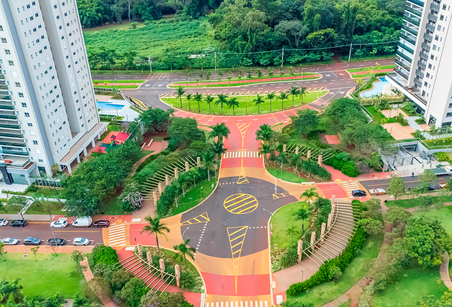 Foto da vista aérea da rotunda central do bairro planejado Ilhas do Sul