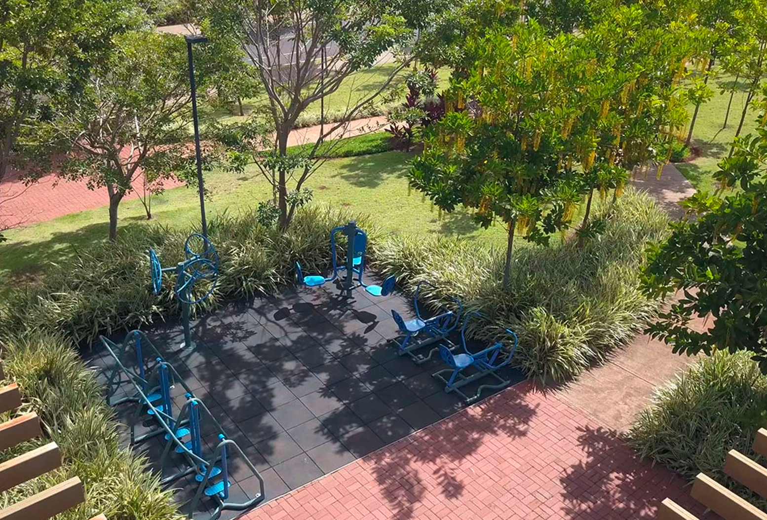 Vista aérea da Academia ao Ar Livre no bairro planejado Ilhas do Sul